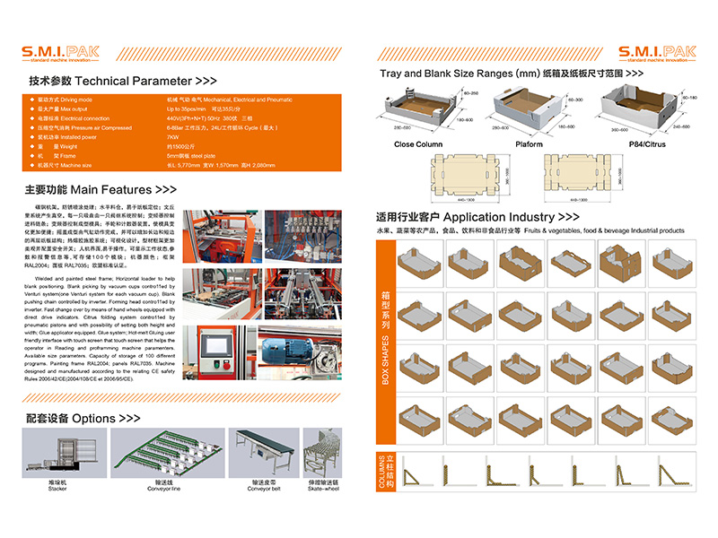 Speed: 35 trays/minute (Trays with reinforced corner posts).產量:35只/分;(立柱形開口箱)